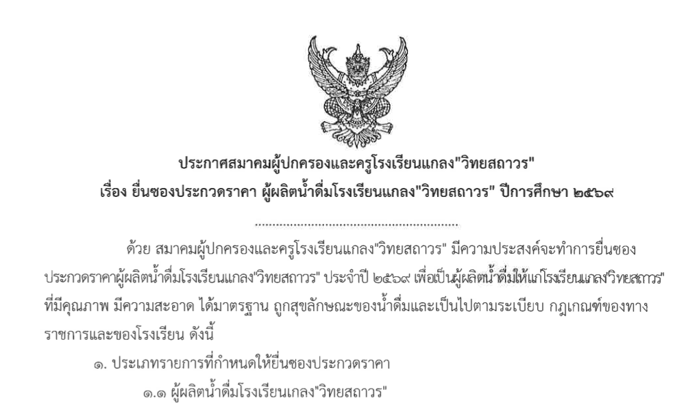 ประกาศยื่นซองประกวดราคาผู้ผลิตน้ำดื่ม ปีการศึกษา 2569 โรงเรียนแกลง”วิทยสถาวร”